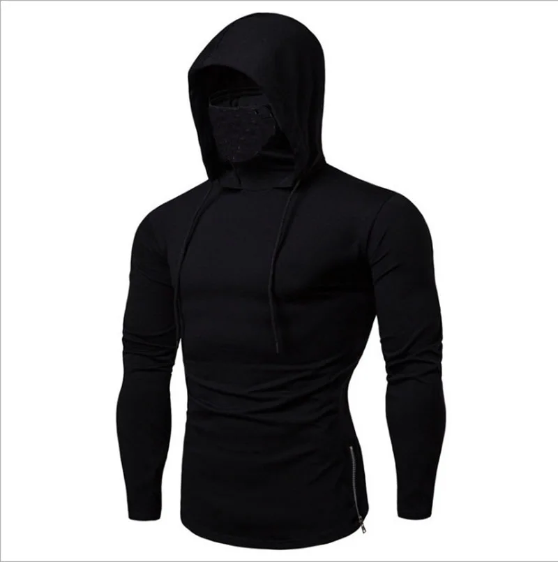 Men Athletic Hoodies Fashion Slim Fit Long Sleeve Sweatshirt with Mask Design Solid Color Sport Fitness Casual Pullover Outwear